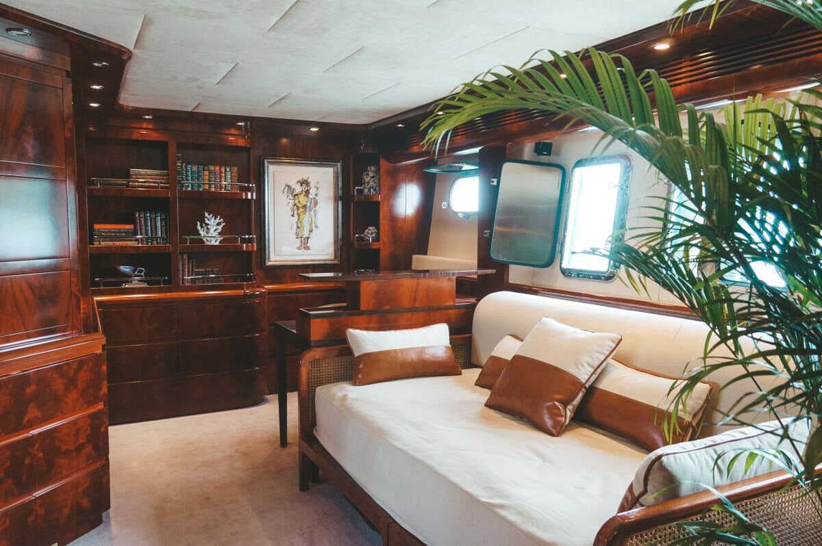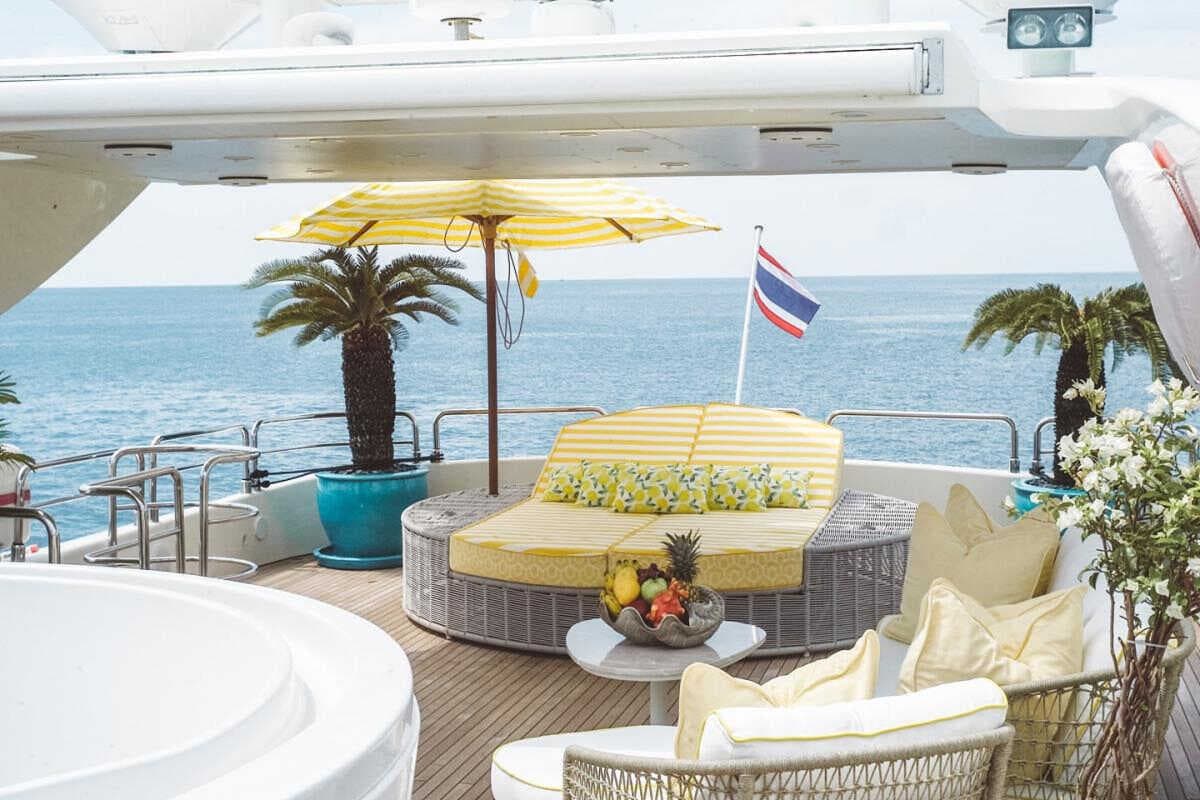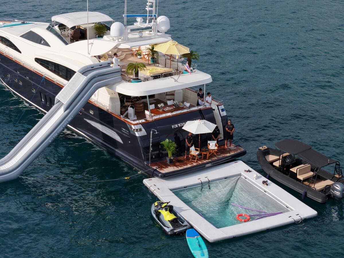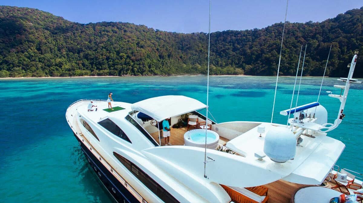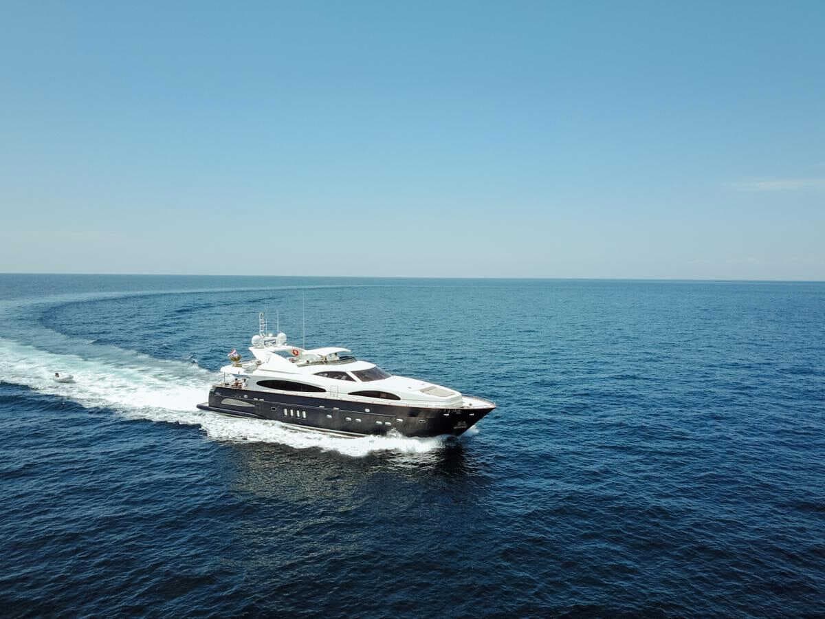 click to expandtap to expandA sleek, dark-hulled silhouette that commands attention on the Andaman Sea. The Astondoa 102 balances Mediterranean styling with engineering performance — featuring a spacious flybridge with jacuzzi, elegant interiors across four cabins, and generous deck space for up to 25 guests. Built by the renowned Spanish shipyard Astondoa, she delivers an unforgettable charter experience from Ao Po Grand Marina.